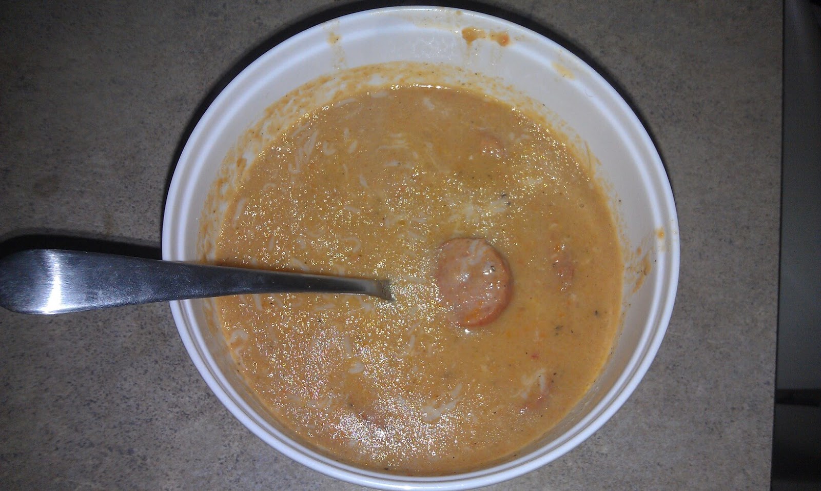 once the soup is finished, add sausages or hot dogs and let it simmer until they are heated through